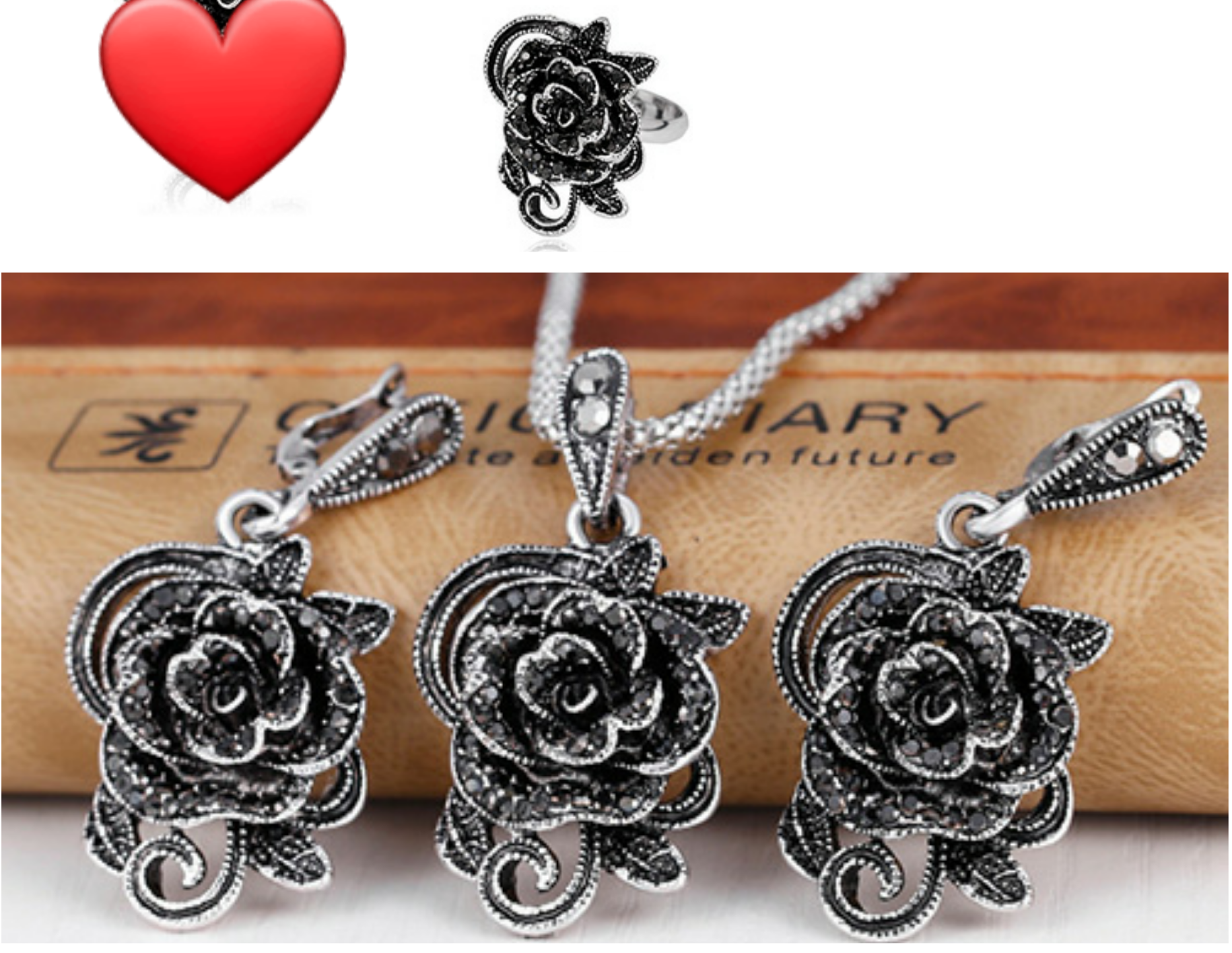 BELLO JUEGO RETRO CON ANILLO, ARETE Y CADENA.